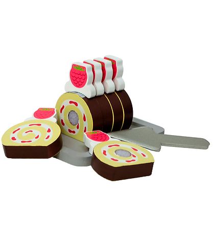 Fin jouets de nourriture MaMaMeMo, composé d'une roulade, d'une assiette à gâteau et d'un emporte-pièce pour le gâteau.