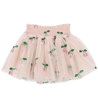 Magnifique jupe Konges Sløjd rose clair, ornée d'une jolie broderie cerise brillant. Jupe taille élastique et sa structure en tulle léger et aérien lui confèrent une allure élégante. Konges Sløjd a su allier design et coupe avec brio.