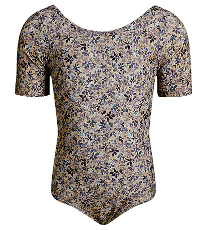 Joli justaucorps de gymnastique Rethinkit avec un imprimé floral imprimés dans des tons de gris bleu et noir, et le fond a un joli motif dans des tons de rose. Sur les côtés, il est gris de couleur unie. Le justaucorps est confectionné dans une qualité sportive.