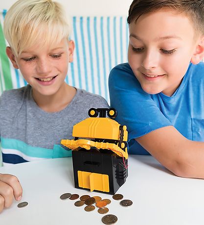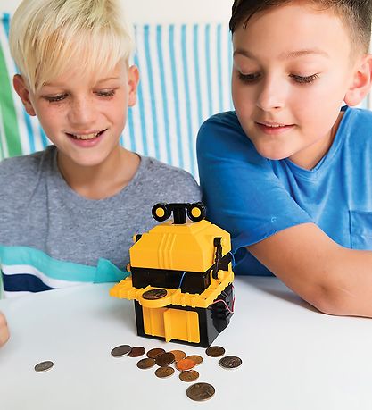 Le 4M est amusant et éducatif pour les plus petits, car ils doivent le construire eux-mêmes et connecter l'électronique. Lorsque le robot est construit, vous lui mettez une pièce de monnaie dans les mains, puis il la mange..