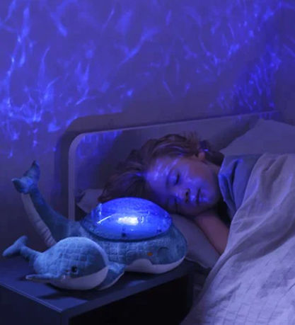 La lampe de chevet Cloud-B combine différents effets pour assurer l'enfant une bonne nuit de sommeil. Les effets sont contrôlés avec des boutons. Un appui sur le premier bouton allume la lampe, et le bouclier projette une lumière à effet sous-marin, une lumière turquoise à effet sous-marin. Le deuxième bouton active le son. Vous pouvez choisir entre deux sons apaisants : Tranquil Melody et Ocean Waves, et le volume peut être réglé avec les deux petits boutons ci-dessous. Le dernier bouton permet d'éteindre les mouvements ondulants de la lumière.