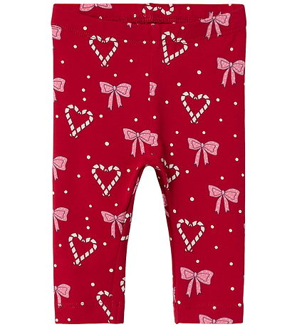 Charmant legging Name It rouge orné d'un imprimé all-over composé de nœuds, de cannes de bonbon en forme de cœur et de points blancs. Name It taille leggings assure un confort optimal.