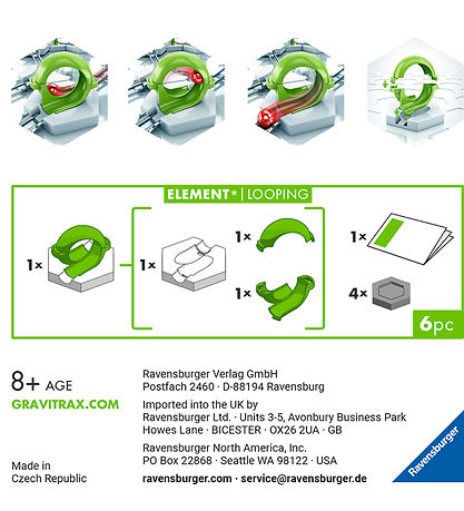 Élément GraviTrax sympa, une extension du modèle Looping avec des composants gris et verts. Le paquet contient six parties qui forment ensemble une boucle.