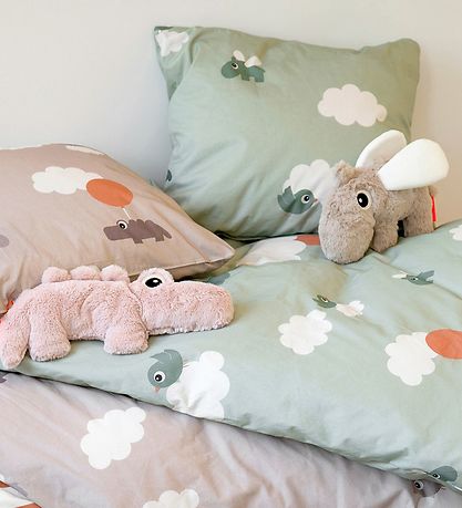 literie Smart Done by Deer en vert avec un imprimé complet de nuages ainsi que d'hippopotames, d'oiseaux et de crocodiles.