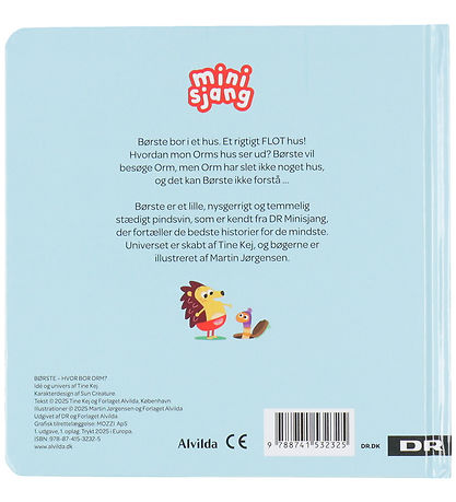 Livre Alvilda coloré avec un motif captivant représentant Børste et Orm sur sa couverture bleu clair. Ce livre raconte l'histoire divertissante de Børste qui cherche à découvrir où vit Orm.