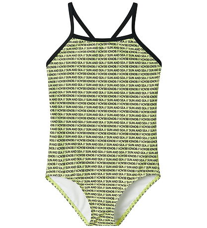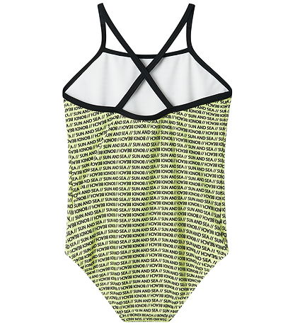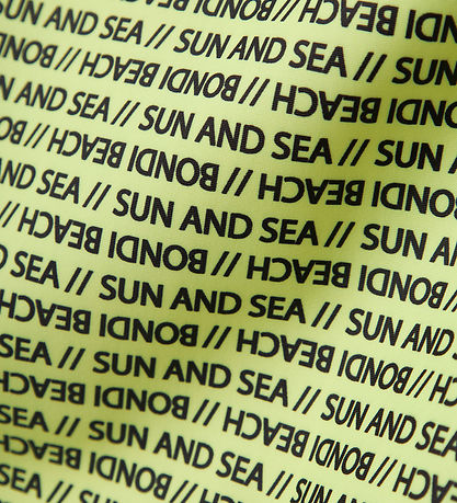 Maillot de bain Smart Name It avec un motif distinctif composé de messages répétés qui disent "SUN AND SEA" dans des tons noir et jaune fluo.