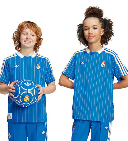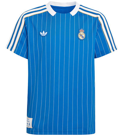 Élégant maillot de football adidas Originals à manches courtes, dans un bleu éclatant. Il arbore de fines a rayures blanches et le logo emblématique du Real Madrid sur la poitrine, lui conférant un look sportif. Fabriqué en tissu Aeroready, il absorbe l'eau et la transpiration pour vous garder au sec pendant votre activité sport.