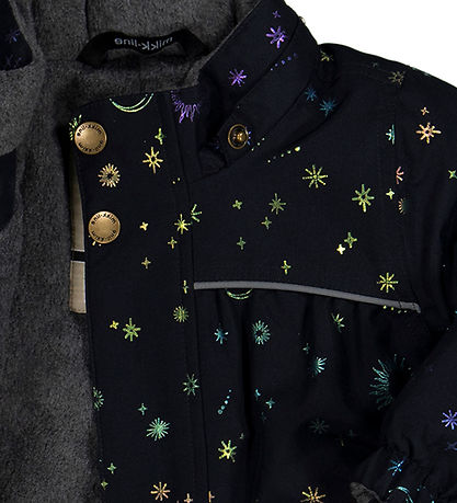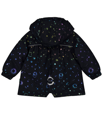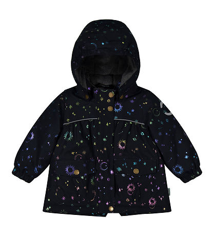 Jolie manteau d'hiver Mikk-Line en bleu marine foncé avec un imprimé intégral de lunes et étoiles dans des couleurs brillantes qui changent en rose, bleu, violet, cuivre et or.
