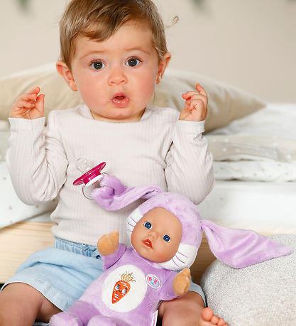 Jolie poupée main BABY Born dans un costume de lapin violet avec une carotte brodée sur le ventre.