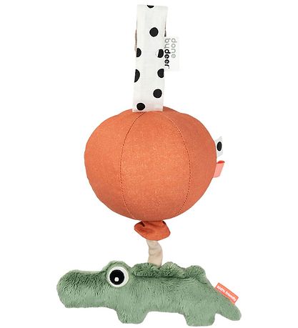Belle mobile musical Done by Deer avec une grand balle orange avec un crocodile vert.