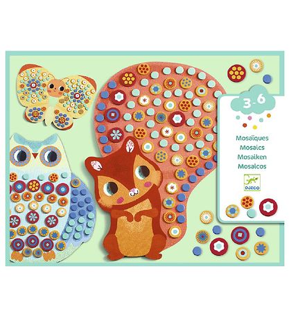 Les Djeco sont réalisées en mousse autocollante, et elles conviennent aux plus petits, qui pourront réaliser des motifs animaux doux et colorés. Ensemble se compose de 3 grands morceaux de carton découpés comme un joli animal et recouverts de feutre doux. Tout autour des animaux, des petits points de couleurs et de tailles indiquent où doivent être collées les petites mosaïques rondes de mousse.