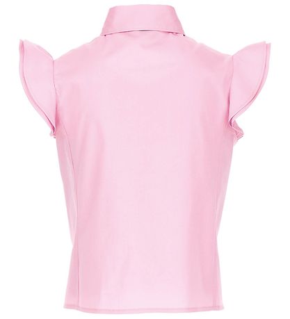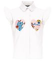 La chemise Moschino a des manches courtes avec des froufrous cloutés. Dans l'encolure se trouve un collier classique et la chemise s'ouvre sur le devant avec des boutons cachés. Il est fabriqué dans une qualité facilement extensible.