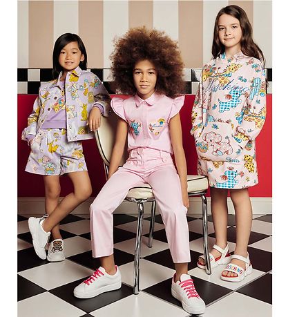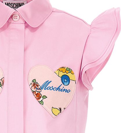 chemise Sweet Moschino en rose, et sur le devant il y a deux coeurs en rose poudré. A droite il y a un chien à bleu à carreaux, et à gauche il est écrit "Moschino" brodé en bleu.