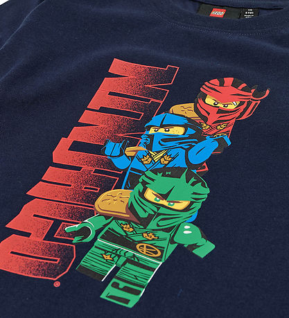 blouse LEGO® Wear Ninjago bleu foncé. chemisier d'un grand imprimé coloré représentant des figurine jouet LEGO® Ninjago et de l'inscription « Ninjago» sur le devant.