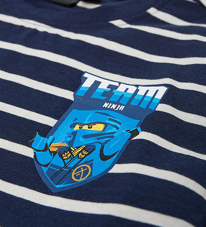 Élégant blouse LEGO® Wear Ninjago, orné d'un motif rayé bleu et blanc classique. Chemisier d'un joli imprimé LEGO® Ninjago dans des tons bleus sur la poitrine, représentant une figurine Ninjago surmontée de l'inscription « Team Ninja».