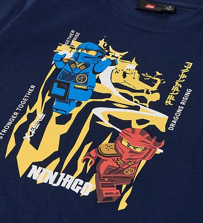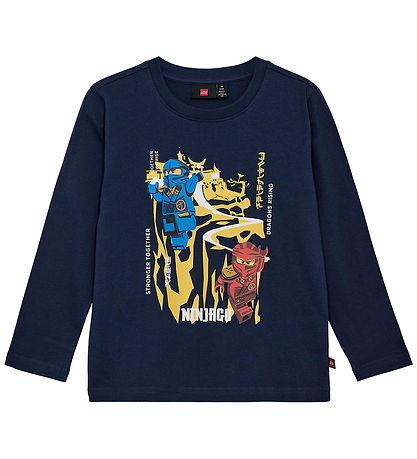 blouse Cool LEGO® Wear Ninjago bleu foncé, très tendance. Le devant est orné d'un imprimé coloré représentant des figurine jouet LEGO® Ninjago entourés de plusieurs slogans, dont « Plus forts ensemble ».