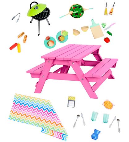 Avec le superbe Picnordbord de Our Generation, les poupées peuvent à la fois manger et préparer à nourriture lors d'un pique-nique. La table comprend un grill vert, des couvert et des assiettes ainsi que de nombreux nourriture passionnants.