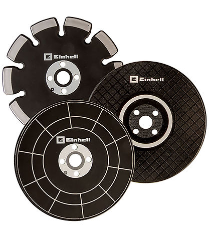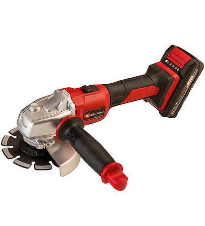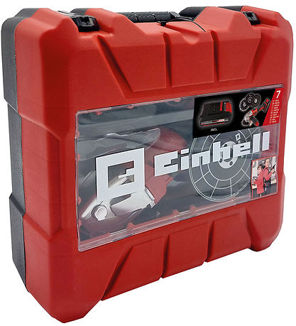 Boîte à outils Smart Einhell avec meuleuse d'angle en rouge, noir et gris. Trois disques de ponçage rotatifs et une batterie remplaçable sont inclus, ce qui convient à tous les outils Einhell.