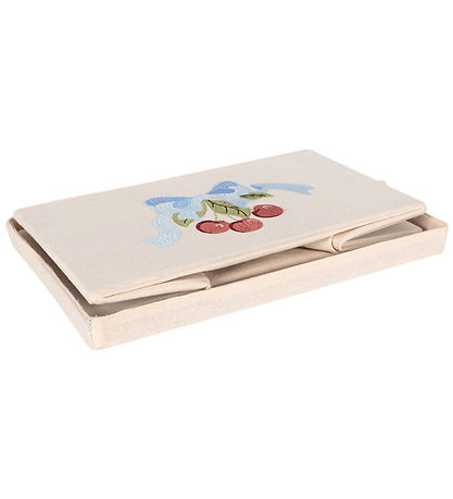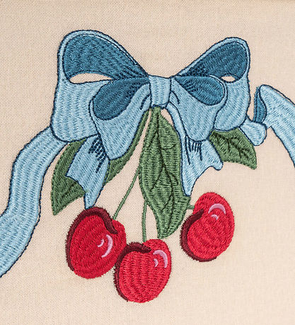 Joli panier de rangement Konges Sløjd dans une teinte rose clair et avec un joli imprimé cerise et nœud sur le devant.