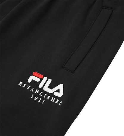 pantalon de jogging Fila pratique, d'un noir classique. Il arbore un logo Fila sobre et un texte sur le devant. Ses chevilles sont bordées de côtes et sa taille élastique assure un pantalons parfait. Deux poches latérales discrètes complètent ce modèle.
