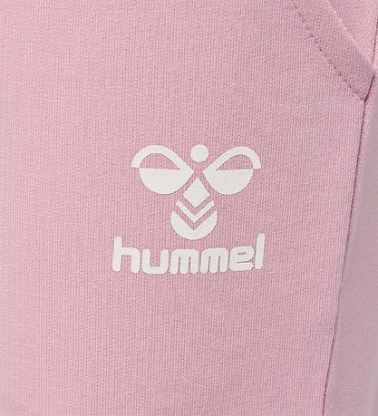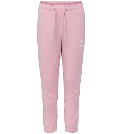 pantalon de jogging de survêtement Hummel fin en rose cendré avec un logo blanc imprimé logo sur la jambe gauche du pantalon et deux chevrons Hummel blancs à l'arrière de la jambe droite du pantalon.