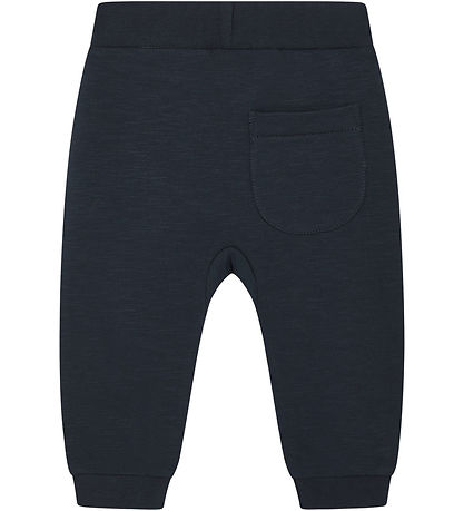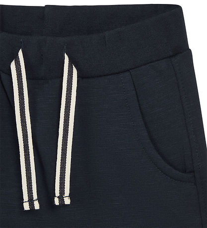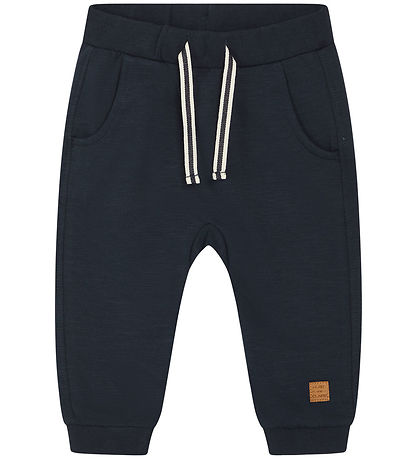 pantalon de jogging confortable Hust and Claire de couleur bleu foncé chiné avec À lacets décoratifs à rayures à la taille et un petit badge logo discret sur une jambe.