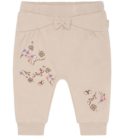 Magnifique pantalon de jogging Hust and Claire dans une teinte beige avec de fines broderies florales en blanc, rose, violet et marron sur les deux jambes et à l'arrière de la jambe gauche. Le pantalon de survêtement a une coupe confortable qui assure une bonne liberté de mouvement pour le jeu et la détente.