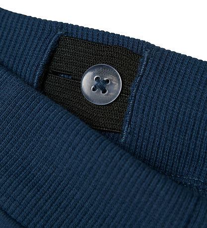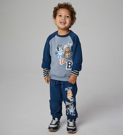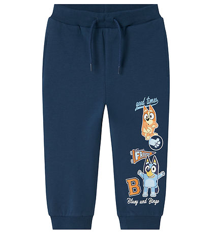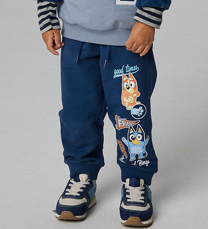 Superbe pantalon de pantalon de jogging Name It It bleu foncé, orné d'un imprimé à motifs Bluey sur la jambe gauche. Il est doté d'une taille élastique ajustable par des boutons à l'intérieur. Il est orné À lacets décoratifs sur le devant et d'une poche de chaque côté. Les ouvertures de jambes sont bords côtelés et l'intérieur est en coton brossé doux.