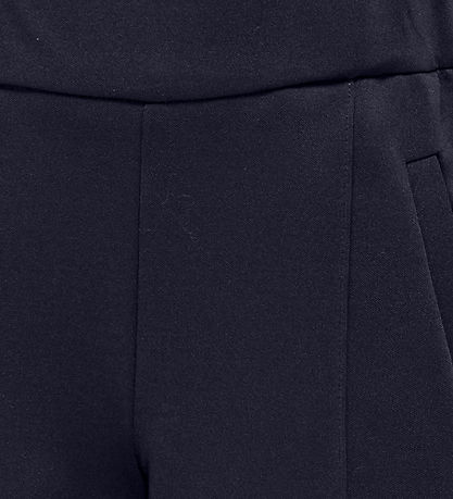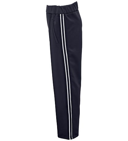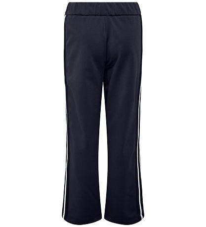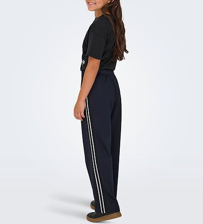 Superbe pantalon Kids Only bleu marine avec des rayures contrastées blanches et noires sur les côtés. Pantalons présente une coupe décontractée et des jambes larges. Il est doté d'une large à la taille élastique ajustable par des boutons à l'intérieur. Une poche de chaque côté et des coutures décoratives ornent le devant.