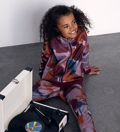 Joli pantalon Hummel bordeaux orné d'un imprimé complet de différentes couleurs. Les deux extérieur arborent les chevrons caractéristiques bordeaux et dorés, et sur le côté gauche, un bourdon doré.