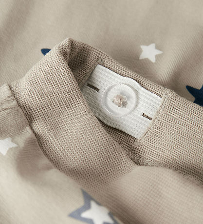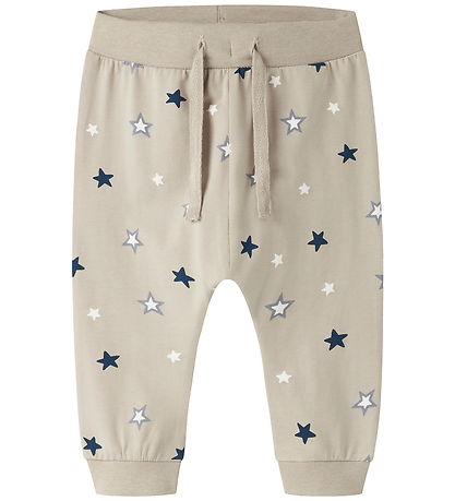 Joli pantalon Name It beige imprimés d'un imprimé étoiles bleu et blanc. Name It est doté d'une pantalons élastique, ajustable à l'intérieur grâce à des boutons et À lacets pratiques, pour un ajustement parfait. Les jambes sont bordées de bords côtelés pour un ajustement confortable et ajusté.
