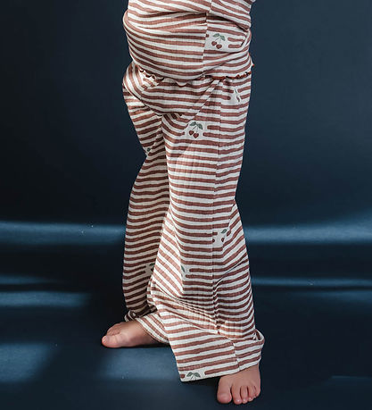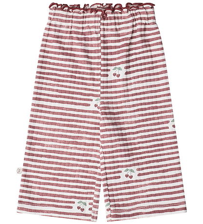 Joli pantalon That's Mine motif de a rayures horizontales rose foncé et blanches. Par endroits, le tissu est orné de petits motifs cerises qui lui confèrent un charme particulier.