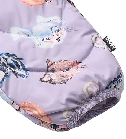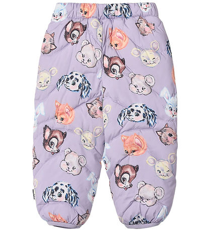 Joli pantalon de ski Molo dans une teinte violet clair avec un motif de jolies têtes d'animaux de différentes couleurs et des coutures ondulées.