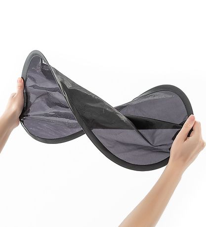 pare-soleil Smart Reer en noir. Dans l'emballage, il y a deux parasols et ils sont livrés avec un petit sac de rangement lorsqu'ils ne sont pas utilisés.