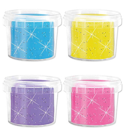 Cette boîte contient 4 seaux de 90g chacun, dans les couleurs bleu, jaune, violet et rose.