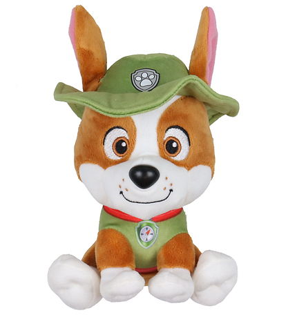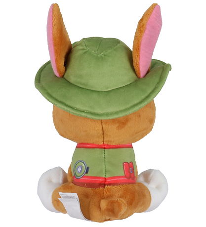 Bonne peluche Paw Patrol en forme de chien Tracker, portant sa tenue verte emblématique et son chapeau.