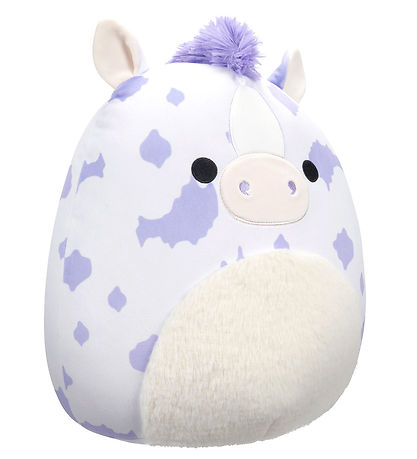 peluche en peluche Squishmallows douillet en forme de cheval Abelita dans un motif violet et blanc avec un ventre et une crinière en peluche. Peluche est conçu comme un oreiller tour avec un visage et des détails brodés.
