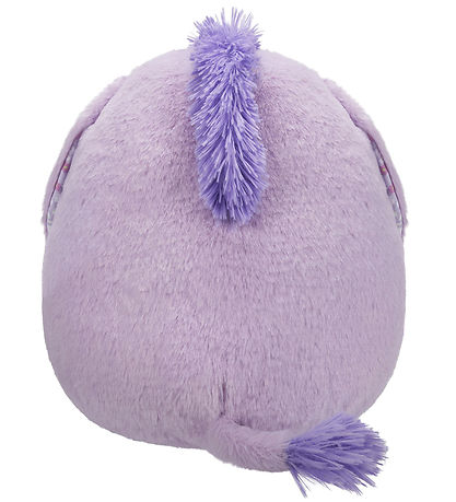 peluche Squishmallows douillet en forme d'âne Delzi de couleur violette avec un ventre fleuri, de longues oreilles et un dessus en peluche. Peluche est conçu comme un oreiller tour avec un visage et des détails brodés.