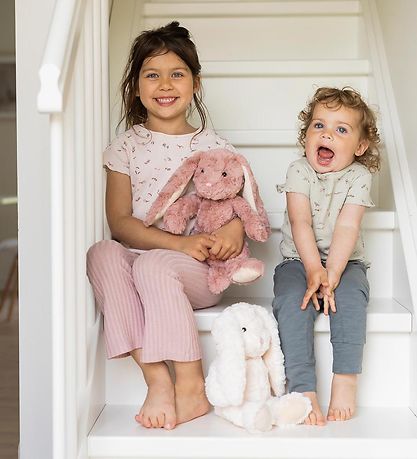 Joli peluche Teddykompaniet en forme de lapin rose cendré, avec un nez rose et des yeux marron.