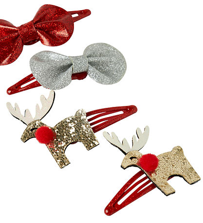 Élégantes pinces à cheveux Name It, vendues par 4 Pack. Deux nœuds brillants rouges et argentés et deux rennes dorés scintillants au nez rouge. Name It pinces à cheveux apportent une touche festive à toutes vos coiffures.