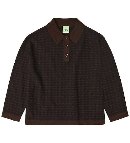 Élégant polo FUB à manches longues, orné d'un motif à carreaux classique dans des tons marron foncé et bleu foncé. Son col polo à trois boutons sur le devant ajoute une touche intemporelle à son look épuré.
