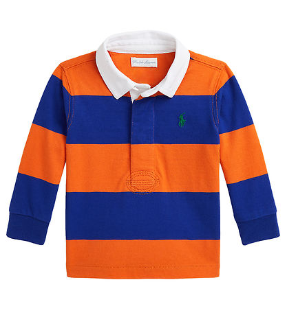 Joli Polo Ralph Lauren à larges a rayures horizontales orange et bleues et le col est blanc. Un petit logo vert est brodé sur le côté gauche du devant.