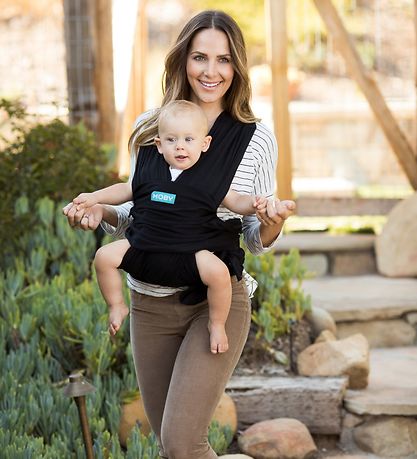 porte-bébés en echarpe Moby fin en noir de couleur unie avec une marque bleue sur le devant avec le texte " Moby" en blanc.