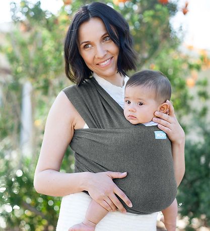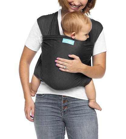 Joli porte-bébés en echarpe Moby en gris foncé de couleur unie avec une marque bleue sur le devant avec le texte " Moby" en blanc.