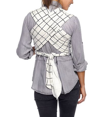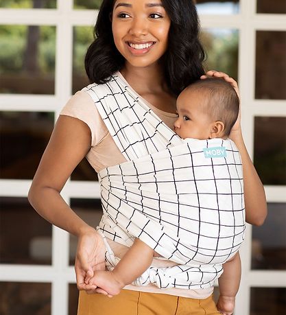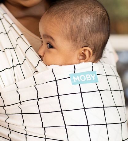Joli porte-bébés en echarpe Moby blanc à carreaux noir et avec une marque bleue sur le devant avec le texte " Moby" en blanc.