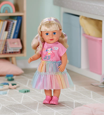 Adorable poupée Baby Born, une petite fille aux yeux bleus prénommée Carla, aux longs cheveux clairs faciles à coiffer. Poupée porte une jolie set composée d'une robe et de chaussures. Elle est également pourvue de deux bandeaux à cheveux elastiques, de quatre barrettes et d'une brosse à poupée.