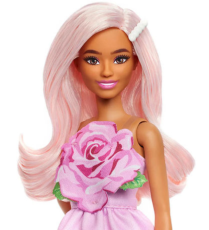 Belle poupée Barbie aux cheveux longs et roses et aux yeux marron portant une robe rose et des chaussures à talons hauts.