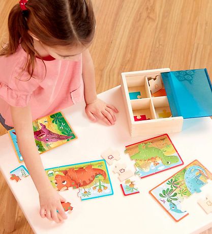 Joli puzzle B. toys dans une boîte en bois, contenant quatre puzzles avec de jolis motifs de dino, tous composés de 12 briques.