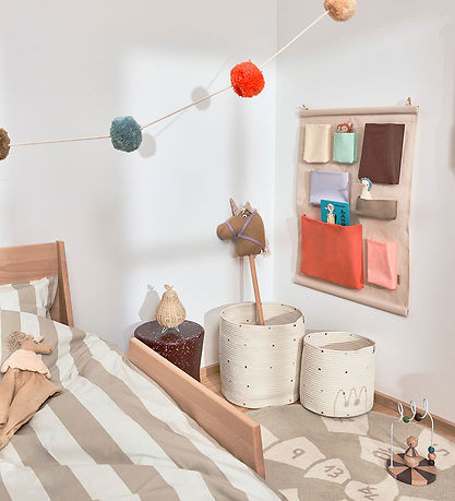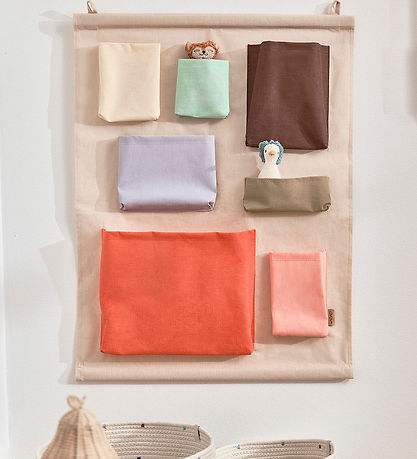Joli rangement mural OYOY de couleur beige avec des poches aux belles couleurs.