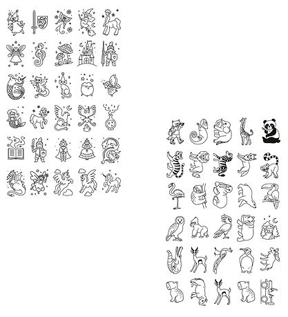 Motifs de dessin amusants Kidywolf sur le thème des conte de fée et des animaux. Ce Ensemble contient 60 feuilles à utiliser sur une planche à dessin Kidydraw Mini. Ces motifs permettent de laisser libre cours à sa créativité et de créer de magnifiques dessins sur la planche à dessin.